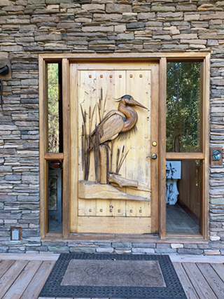 Touring their self-made home was awe-inspiring. Karl designed it in high school — complete with blueprints and a scale model — and started building it 50 years ago. Since then, he’s added numerous large and small carvings, built four fireplaces, most of the furniture, done extensive metal work, acrylic and wax-based encaustic paintings and crafted a glass chandelier, stained glass and  wheel pottery. Outside, Karl built a huge shop, barn and outdoor living room. For his son’s wedding he built a deck, gazebo and bridge spanning a pond.