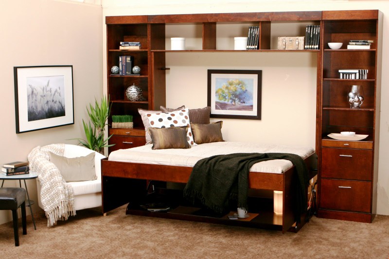 Another favorite is the wall bed. Modeled after the classic murphy bed, invented around 1900 by a New York opera singer to convert his small sleeping area into a parlor when entertaining a lady.