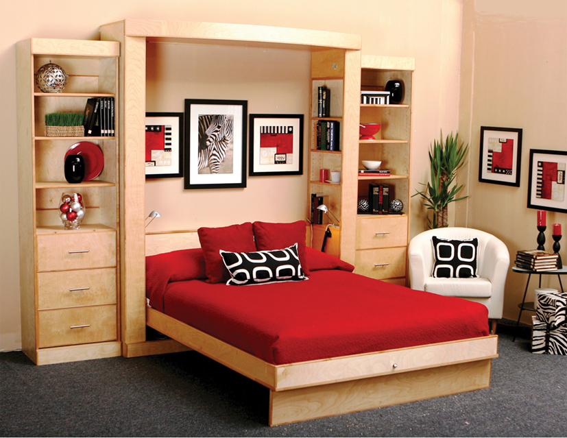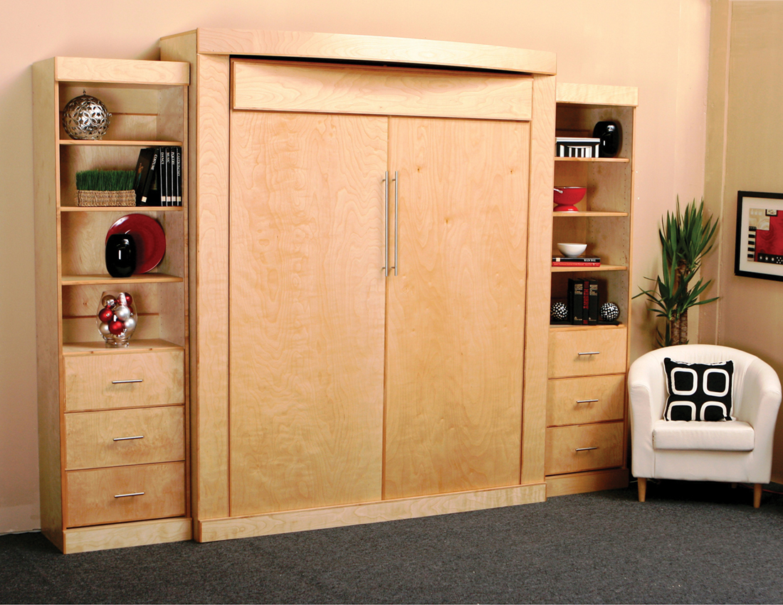 A wall bed can be flanked by shelves or include a drop-down table. Piston lifts support the mattress platform, so lifting and lowering requires only a light pull.