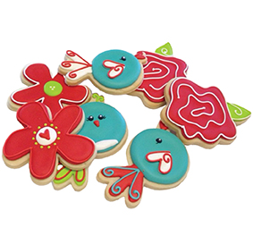 Preparing such an order takes about three days: making, cutting and baking the dough; using different icing consistencies for piping edges or ‘flooding’ whole cookies, and detail work; then wrapping each cookie in cellophane.