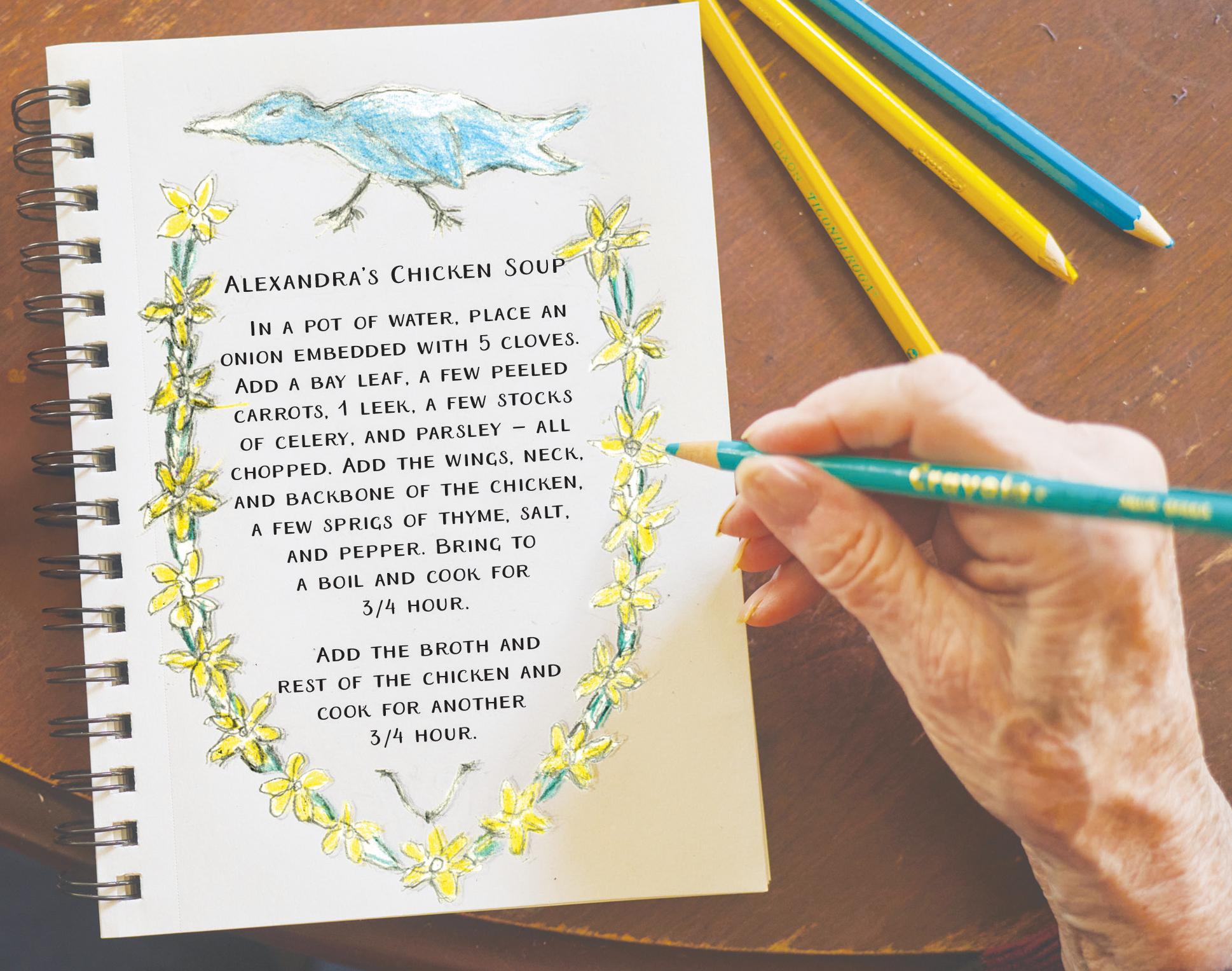 Mary adds, “Mom has memory loss and broke her hip two years ago — slowing her down. Cooking and baking were a big part of her life. She does it less now but often offers to help. See the recipe for Alexandra’s famous chicken soup at the end of the story.